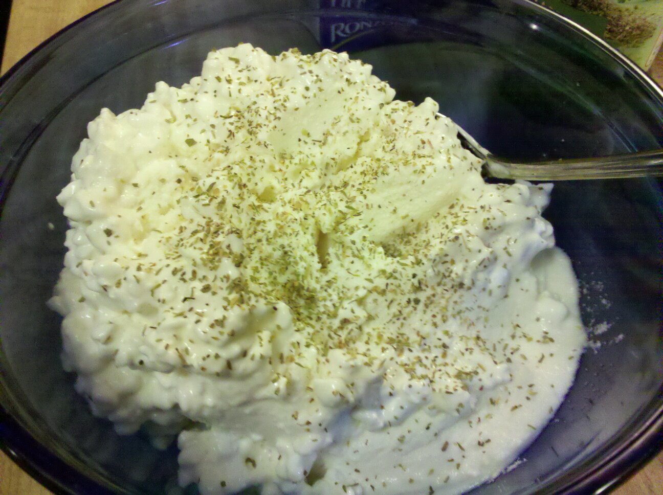 You'll want to mix together the 3/4 container of cottage cheese (and if you're like me, pause to eat the rest) with the ricotta cheese and sprinkle a LIGHT dusting of your Italian Seasoning or Parsley over it (and then if you're still me, sprinkle California Blend Garlic Salt over that).